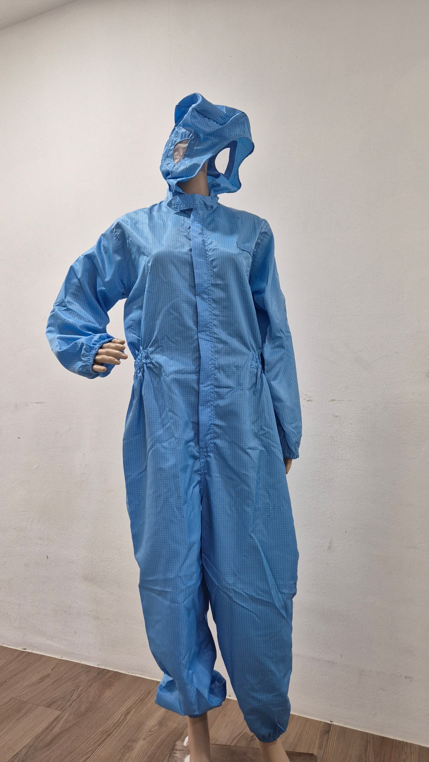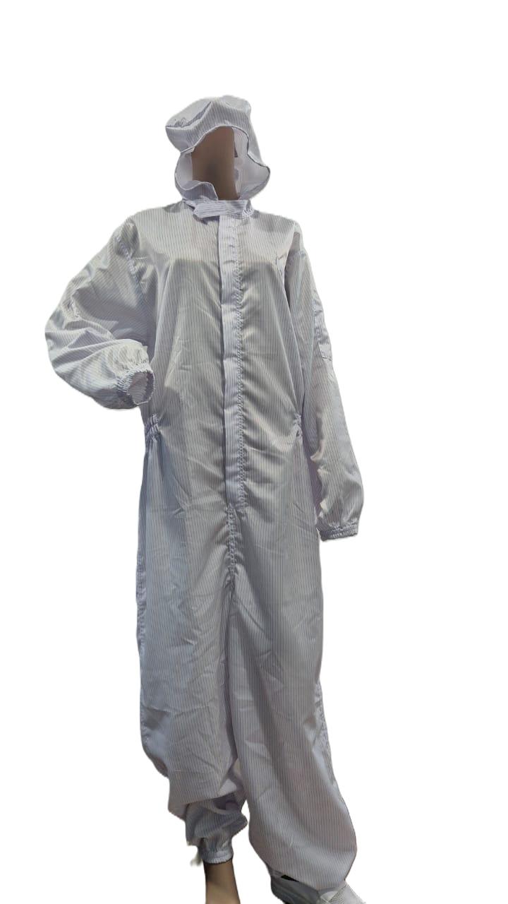 Made from conductive fabric stripe line or cross grid, the jumpsuit effectively release static charges while preventing dust buildup. Moreover, the attached hood provide complete coverage from head to ankle, ensuring full-body protection from static and airborne particles.