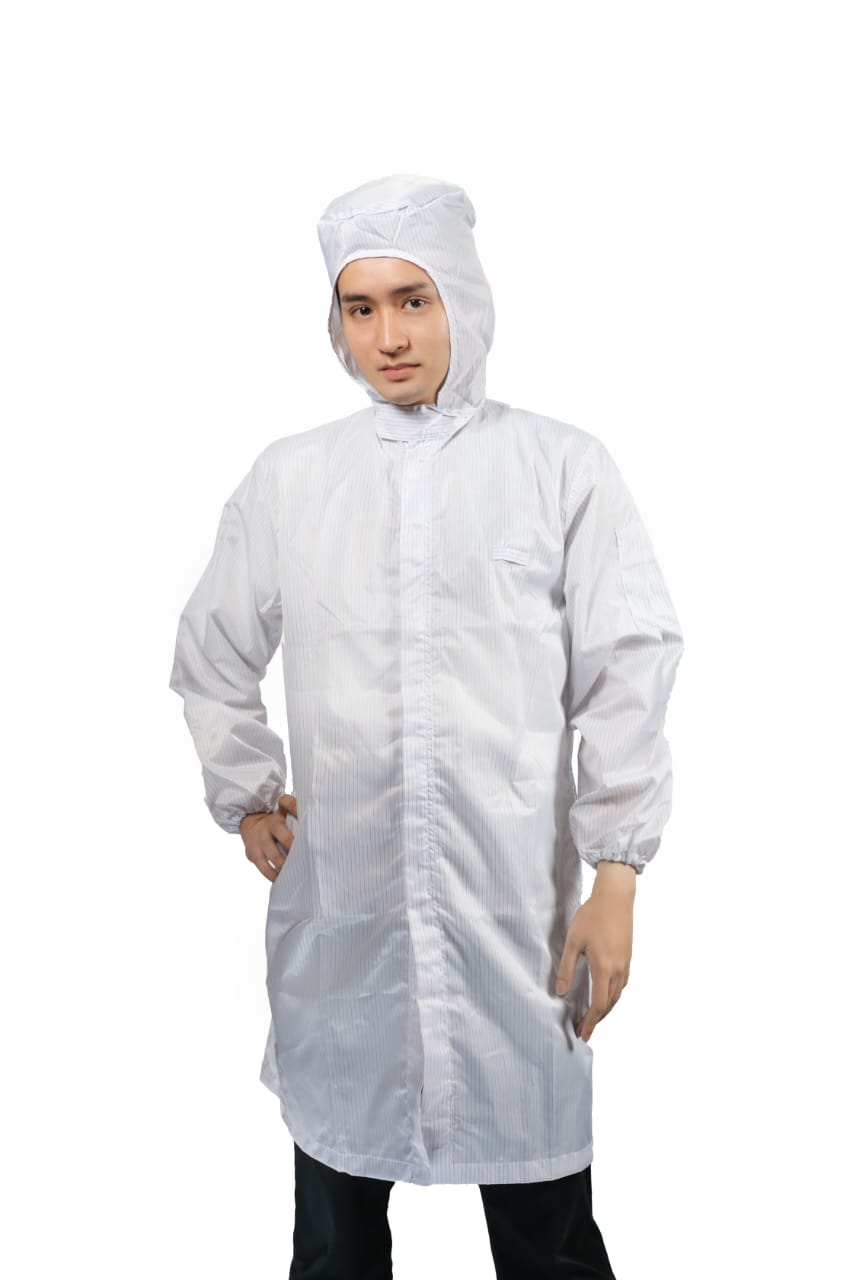 Made from ESD-safe fabric stripe line or cross grid, the smock effectively dissipates static charges to prevent damage to sensitive electronic components and maintain a safe working area. Moreover, The attached hood designed offer full head and neck coverage to minimize particle release and contamination, making it ideal for cleanroom and controlled areas.
